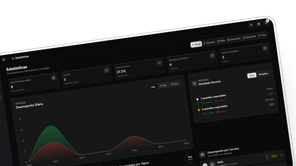 Acompanhe seu desempenho organizado por disciplinas e assuntos, facilitando a identificação de pontos fortes e áreas a melhorar.