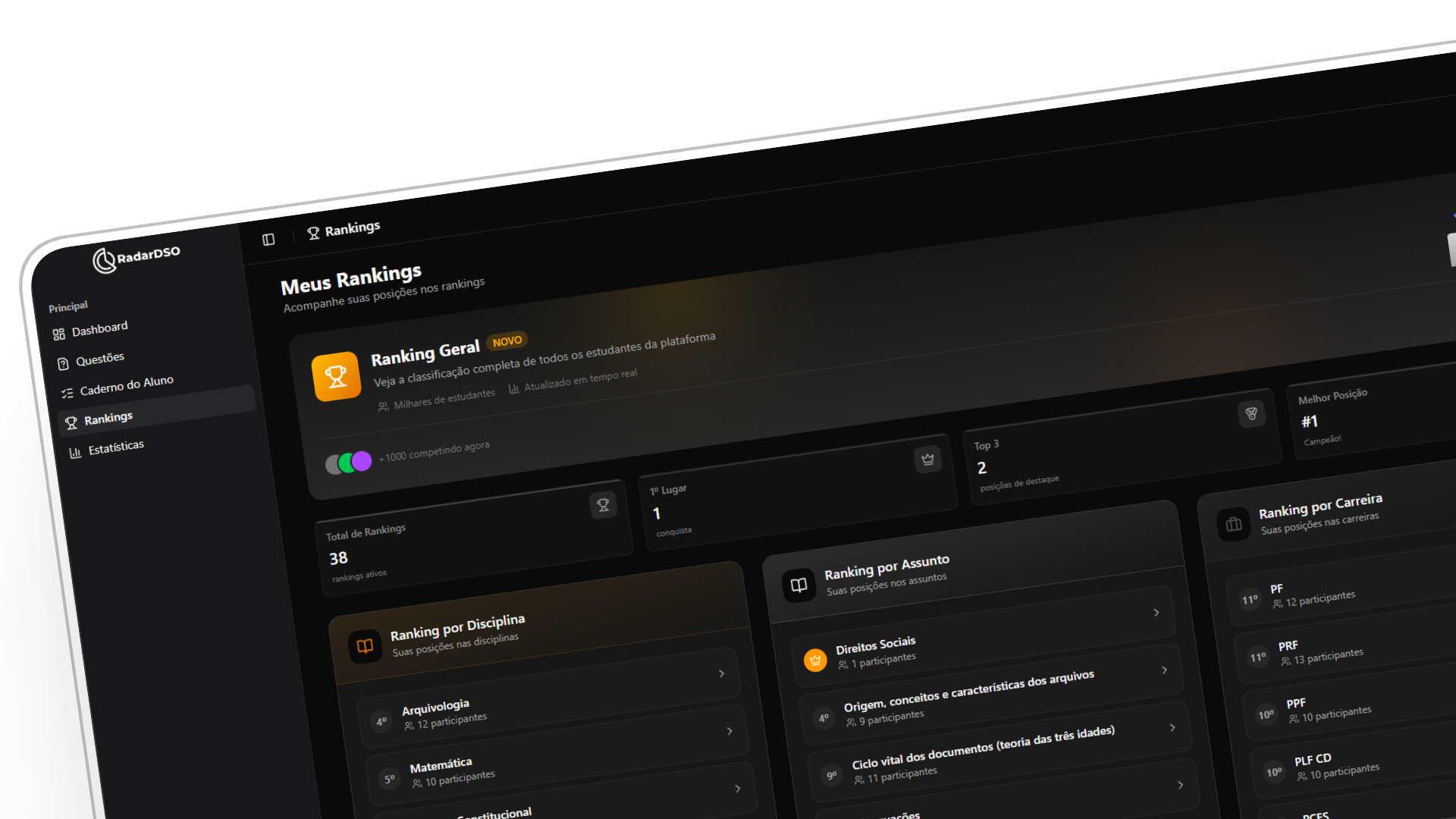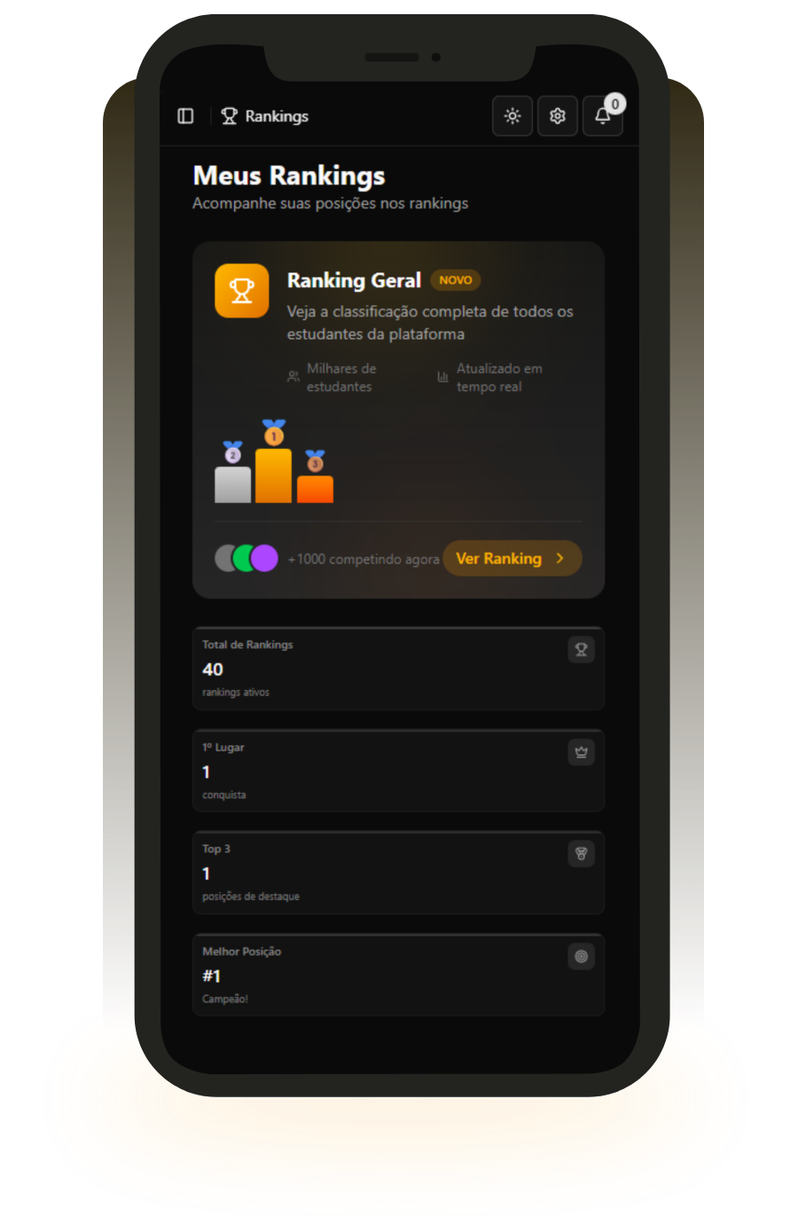 Acompanhe a classificação completa dos estudantes da plataforma, organizada por disciplina, assunto ou carreira.
